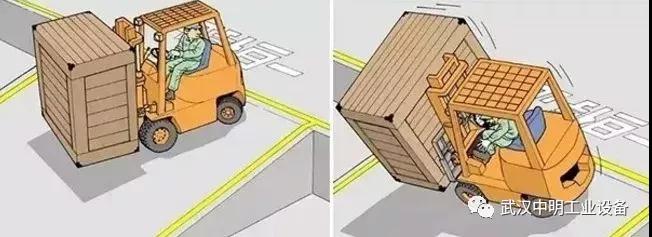 5、叉車在裝貨后,倒向離開時(shí),由于過早轉(zhuǎn)向,導(dǎo)致貨叉未離開貨物,發(fā)生側(cè)翻。